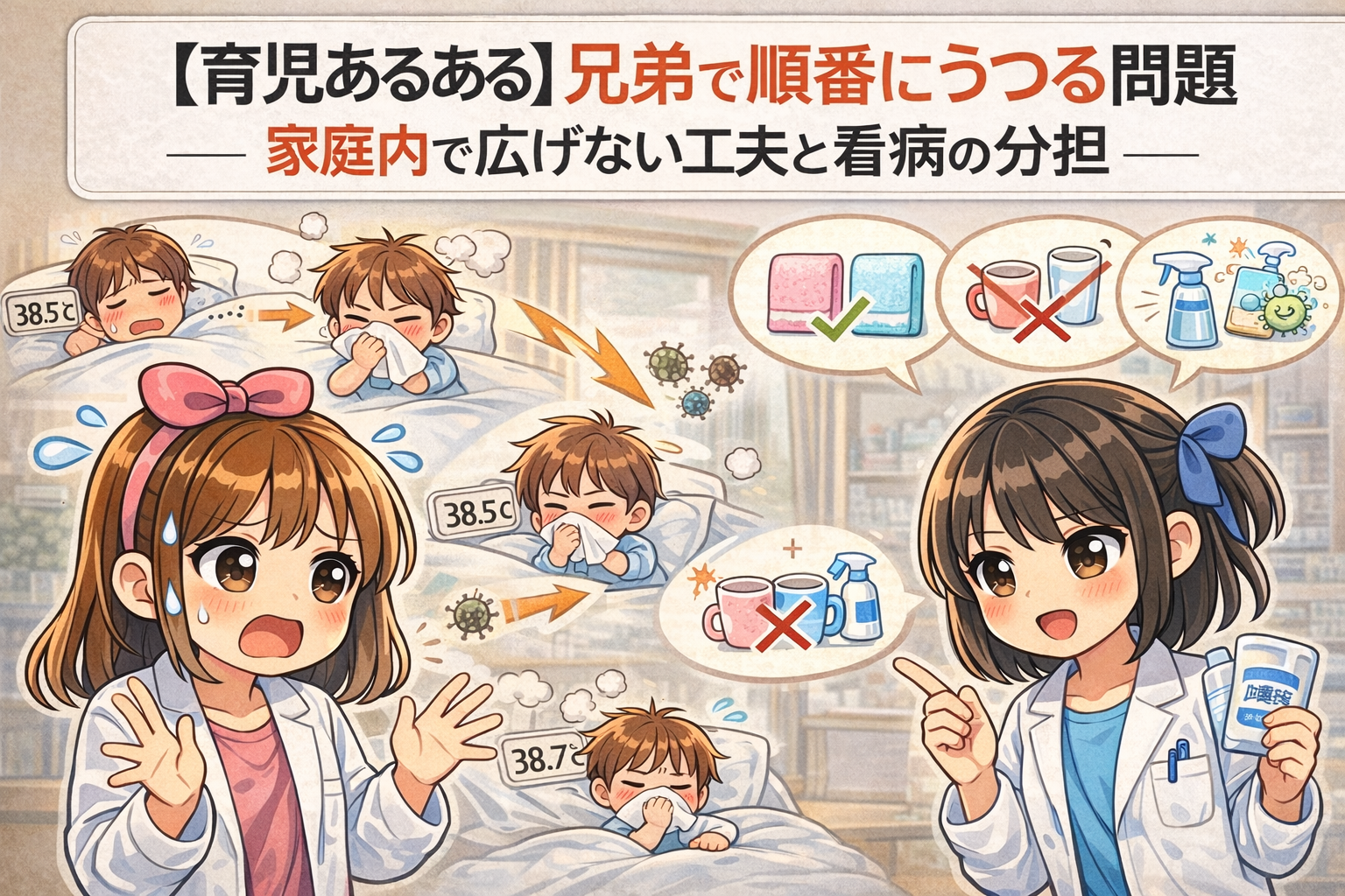 「うん。完全にゼロは難しいけど、“広がり方をゆるくする”のはできるよ。まずはタオル別、コップ別、鼻水の後の手、ここだけでも効果が出やすい。」